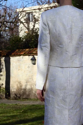 1 Tailleur de mariage robe courte et veste en jacquard brocard T40
