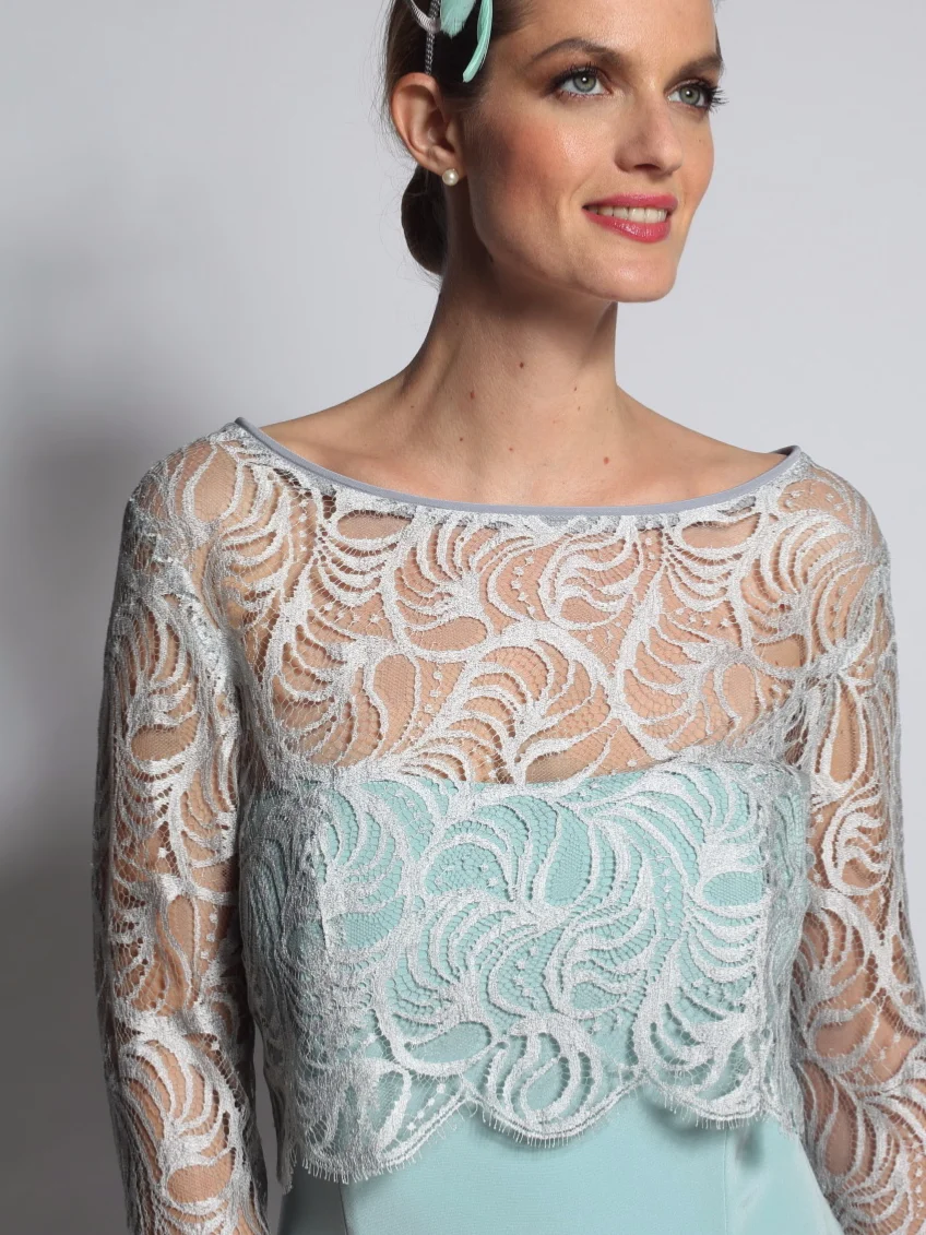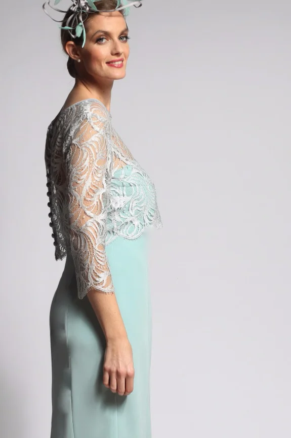 Robe fourreau baleinée avec une coupe extraordinaire pour une silhouette élégante et son petit haut délicat en dentelle de Calais-Caudry fermé par de jolis petits boutons demi-boule .