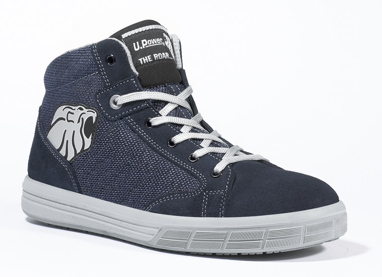 Chaussure de sécurité UPower haute S1P SRC type basket couleur jean’s, en toile CANVAS extra-résistante et croûte de velours souple, respirante et légère.