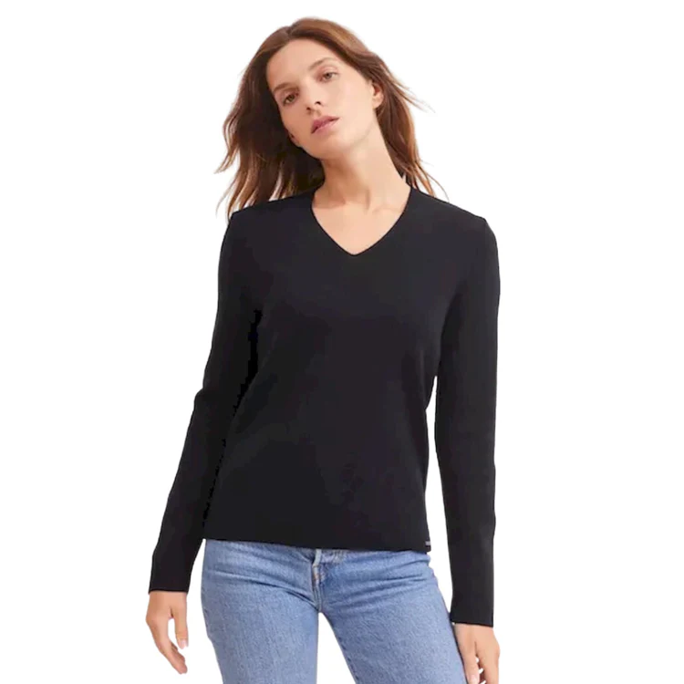 Quelle femme n’a pas besoin d’un chandail col en V noir dans sa garde-robe? Passe-partout, d’une qualité incomparable, typique de Saint-James ce chandail vous habillera années aprés années , sans se démoder!