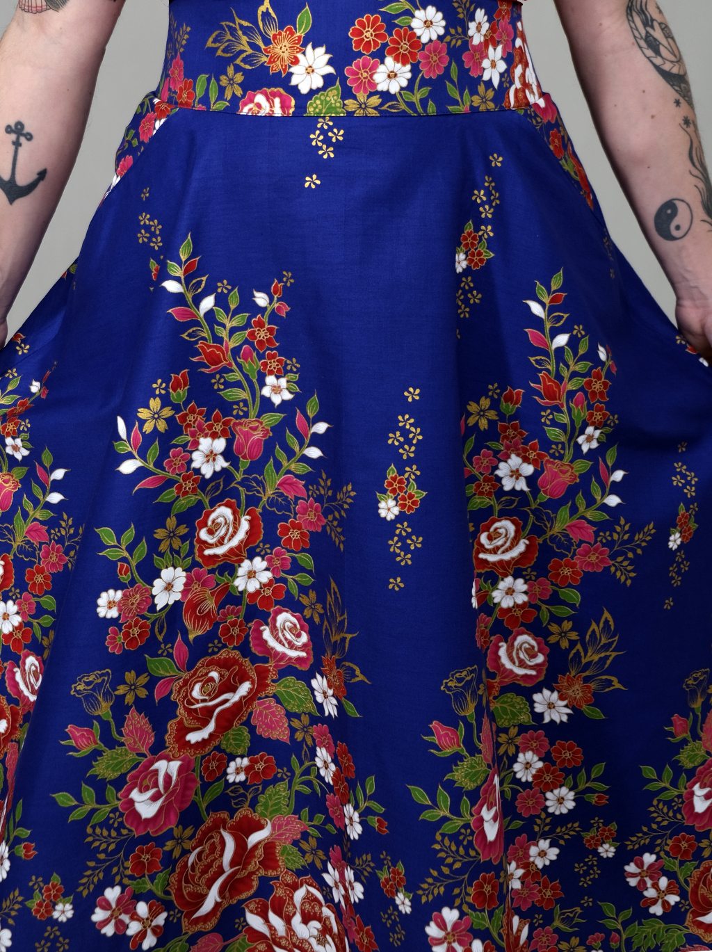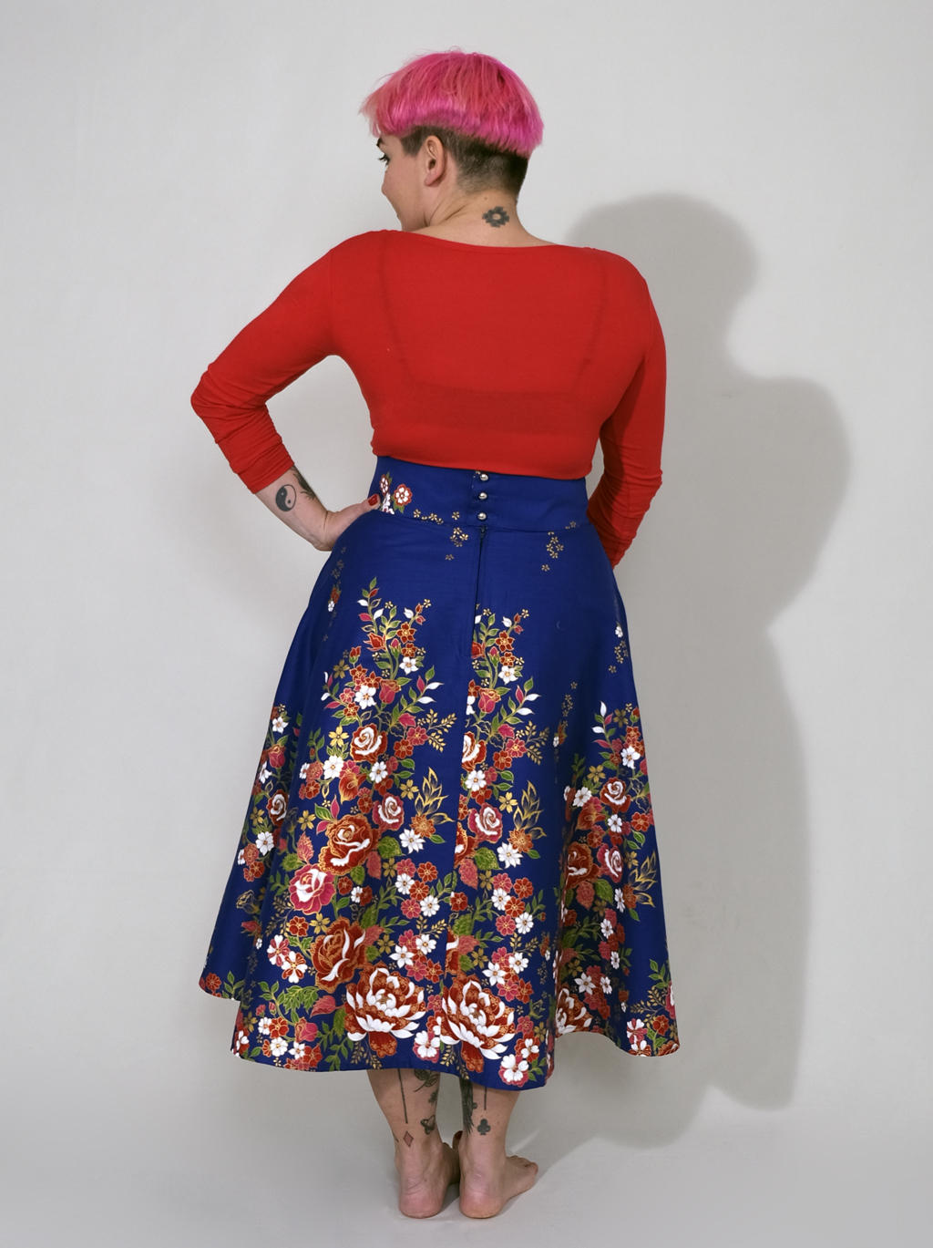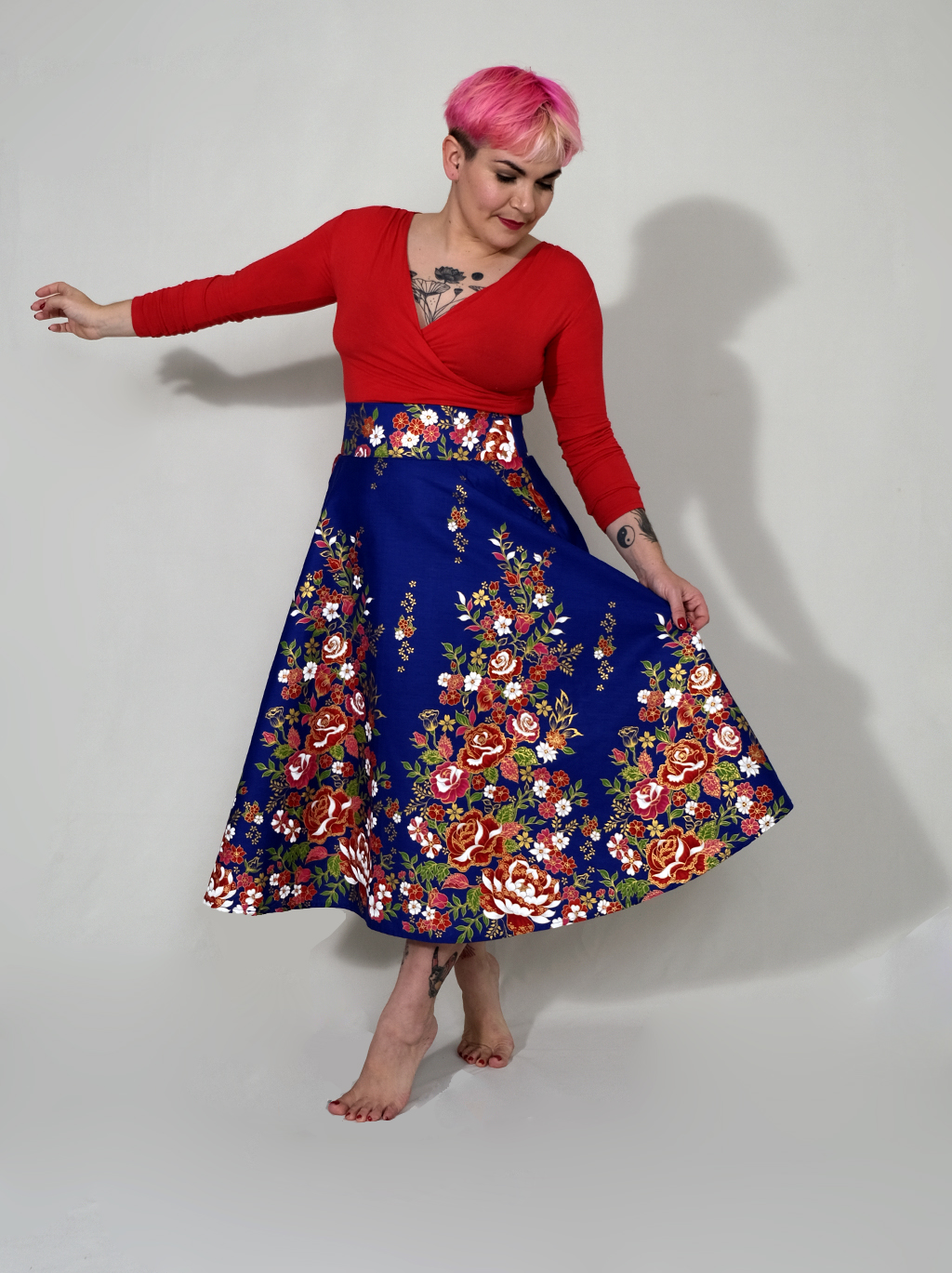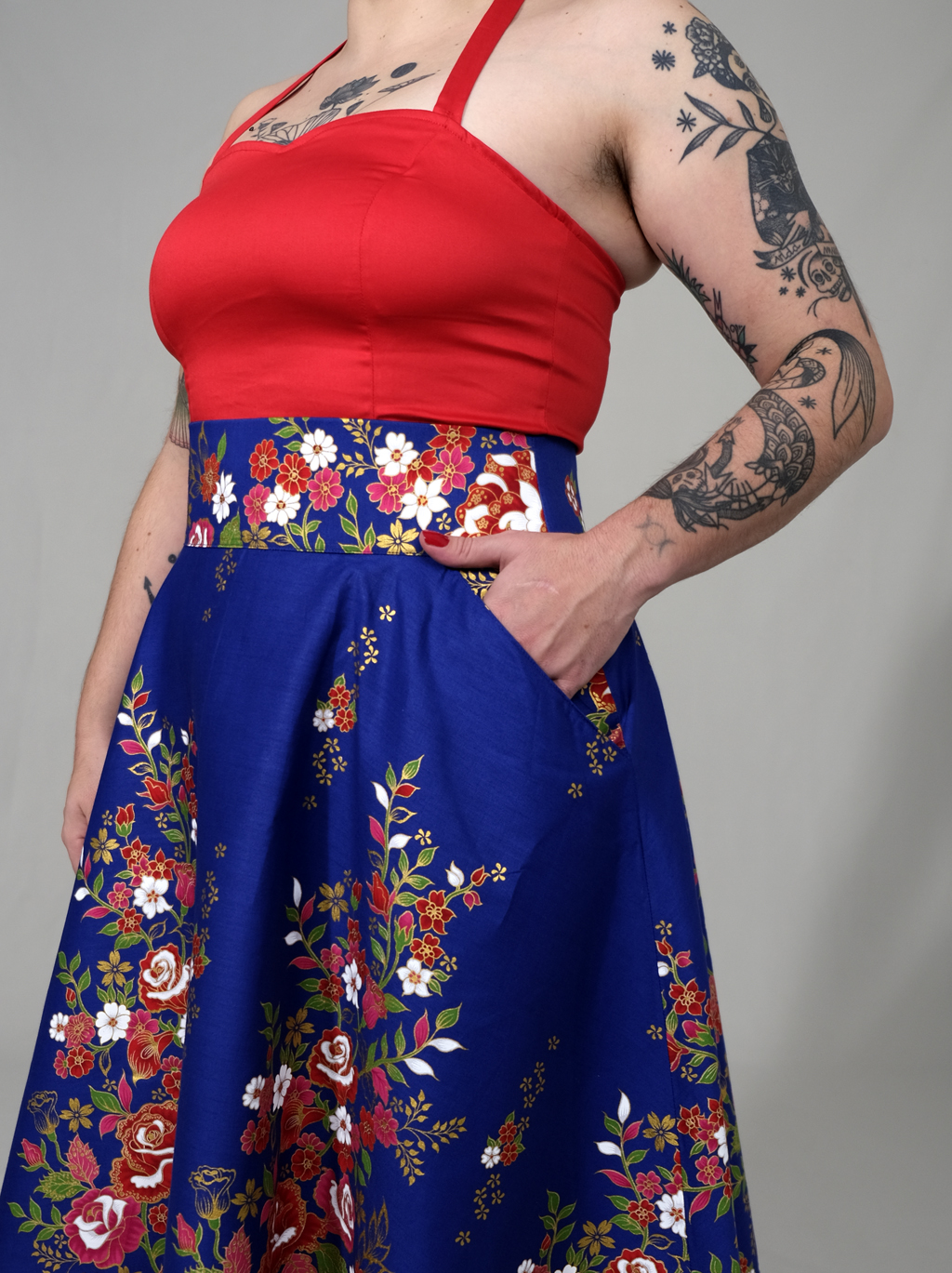 CHARLY : jupe taille haute longueur MIDI bleu éléctrique à fleurs 100% coton