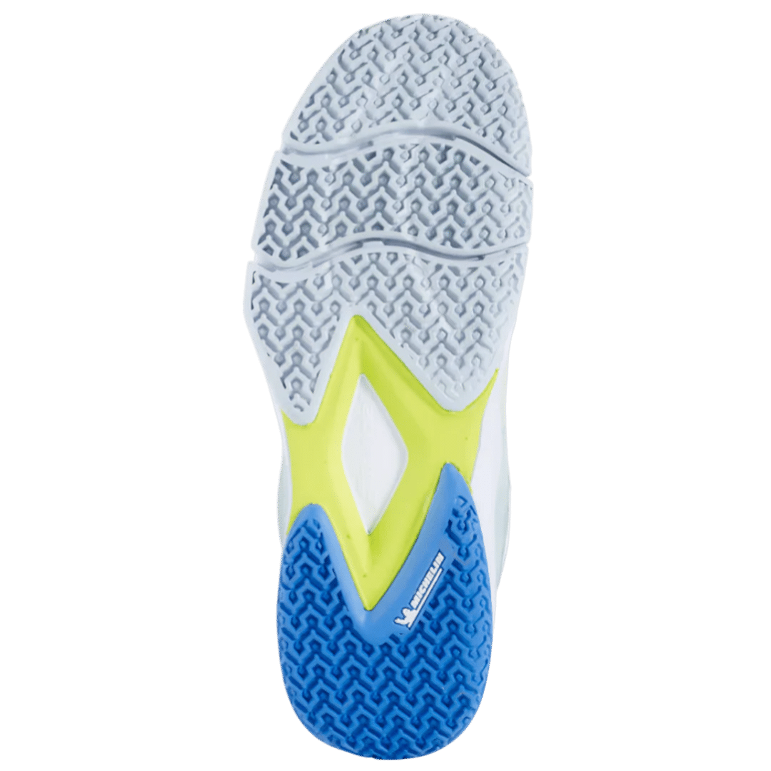 La semelle réalisée en collaboration avec Michelin, entièrement dédiée au padel, assure une adhérence et une durabilité incomparables, même sur les terrains les plus exigeants comme le sable et le gazon synthétique.