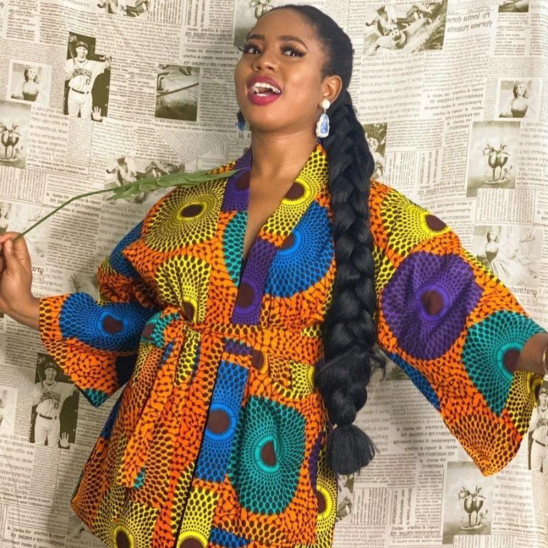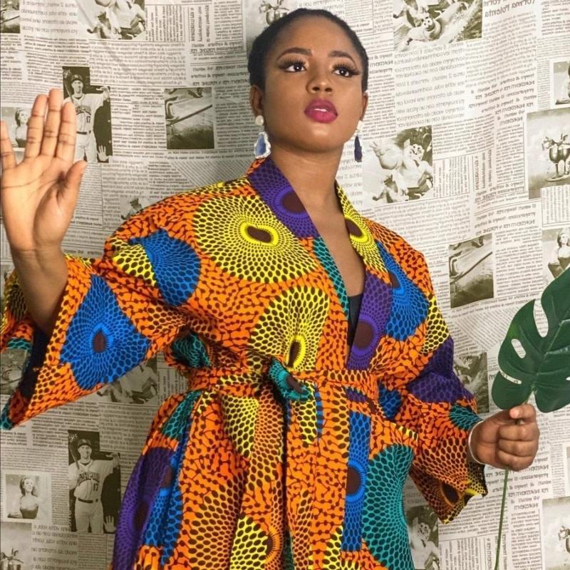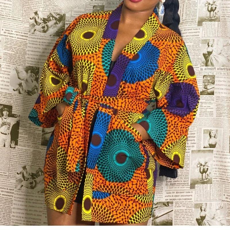 Vibrez de bonheur et complétez votre garde-robe avec notre Kimono Wax Africain à motif de disque !