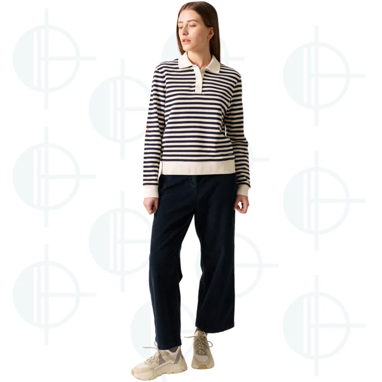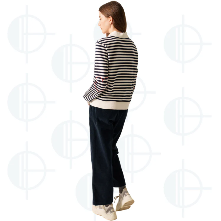 Le polo Nina revisite l’esprit marin avec une touche originale et ludique. Confectionné en coton molletonné doux et confortable, il affiche un motif rayé indémodable rehaussé de coudières en forme de cœur, pour un clin d’œil charmant. Sa coupe droite et ses finitions côtelées assurent un tombé structuré et décontracté à la fois, parfait pour la mi-saison.
