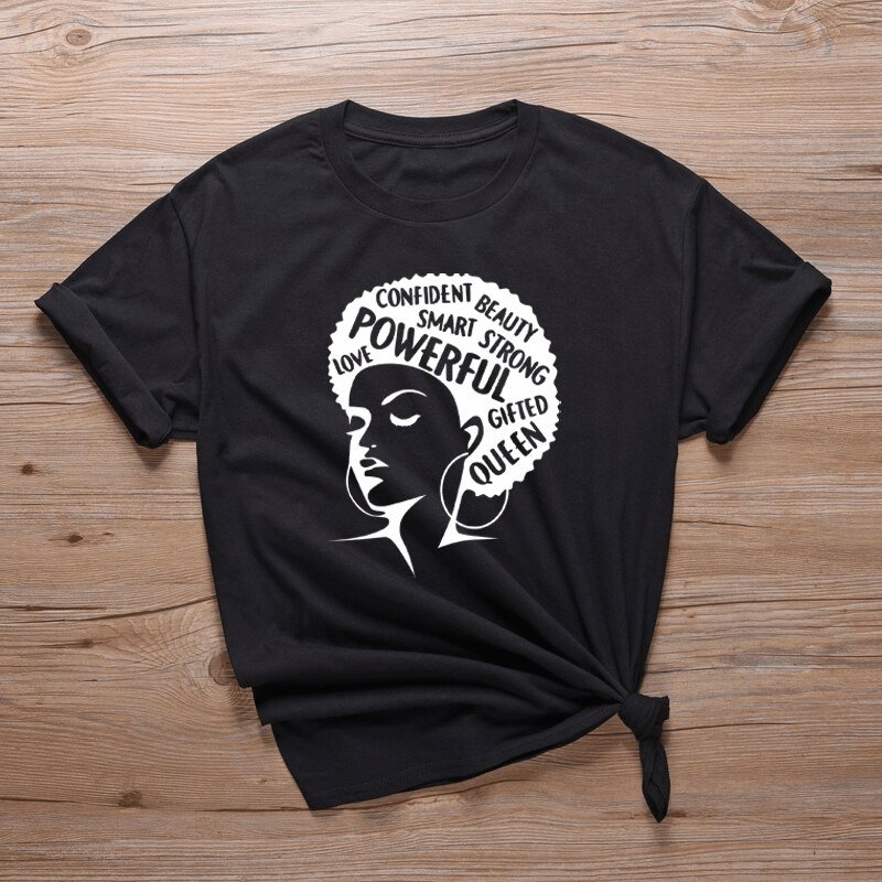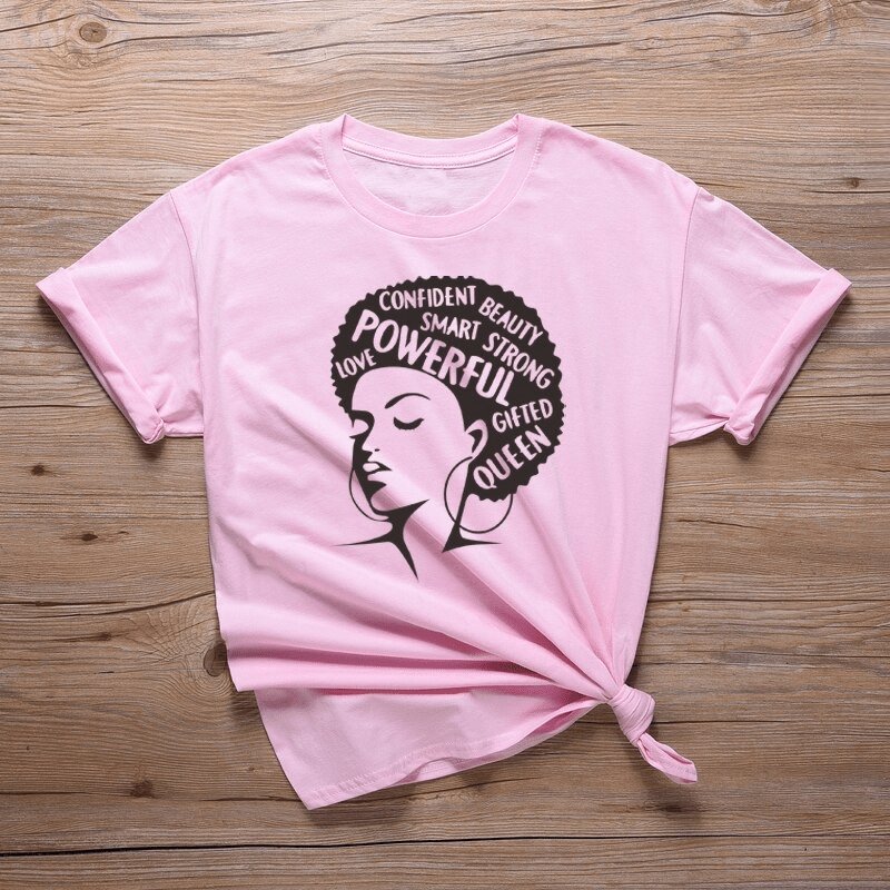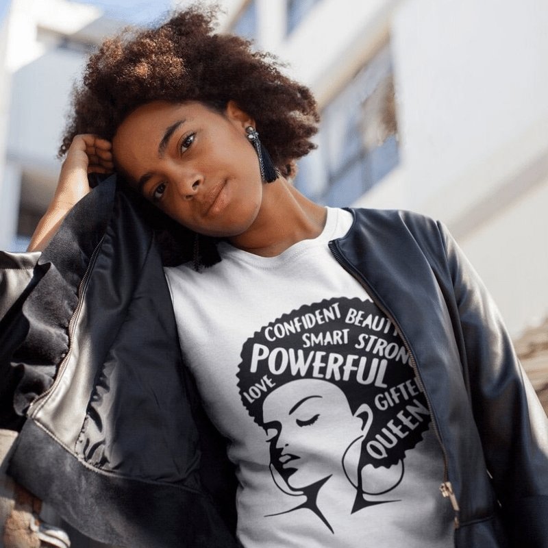 Découvrez notre t-shirt pour femme orné du portrait d’une femme africaine portant des messages de grande valeur.